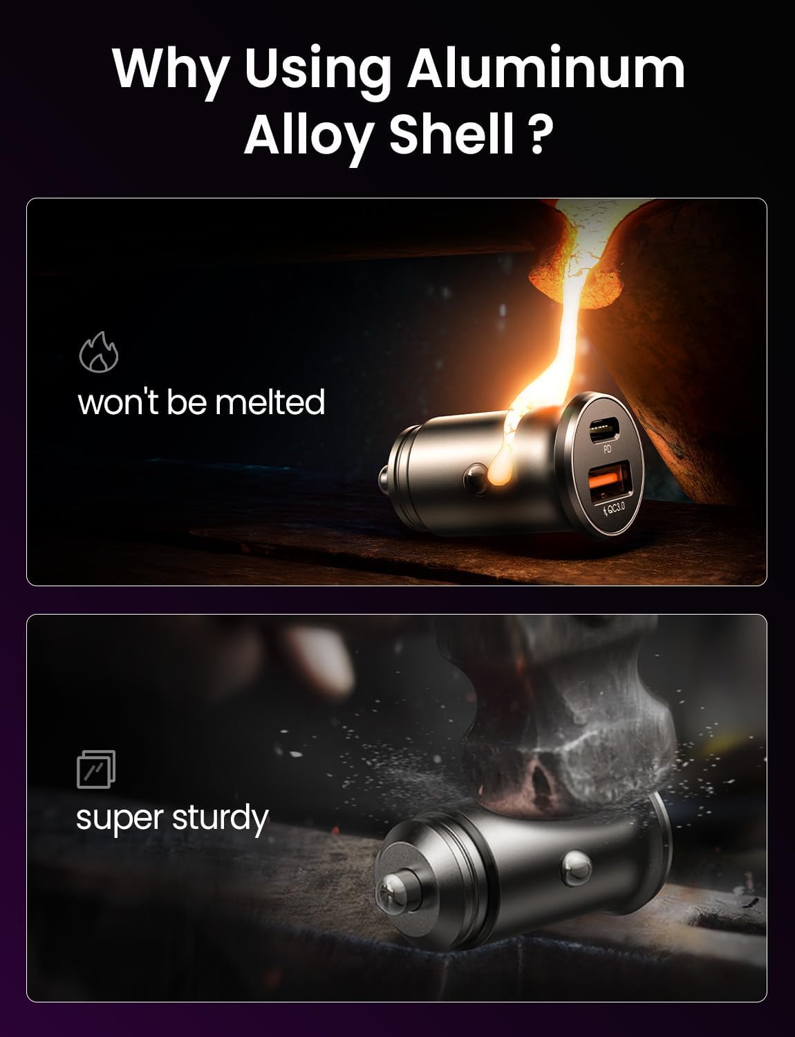• ⚡ ALL ALUMINUM SHELL, WON'T MELT: The high-density aluminum alloy shell can help the car charger iPhone to dissipate heat in the charging process, effectively improving the charging efficiency by about 15% compared to plastic car chargers, and absolutely no melting and danger. The all-metal body also has a unique sense of design and luxurious texture.