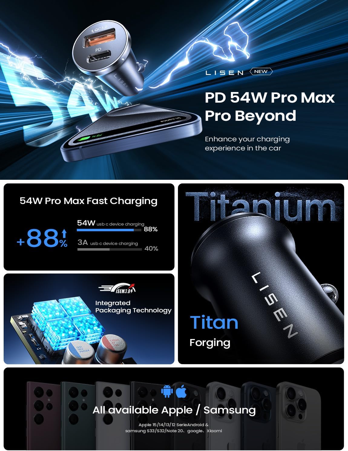 • ⚡ 54 W DUAL FAST CHARGING PORT: LISEN fast charging USB C car charger supporting PD 36W(Max) and QC 18W(Max) high output, can fast charge all prevailing phones and E-devices. This car charger usb c with both of USB-A and USB-C ports can work with all kinds of plugs cables. [NOTE: The fast car charger CANNOT fast charging 2 devices simultaneously.]